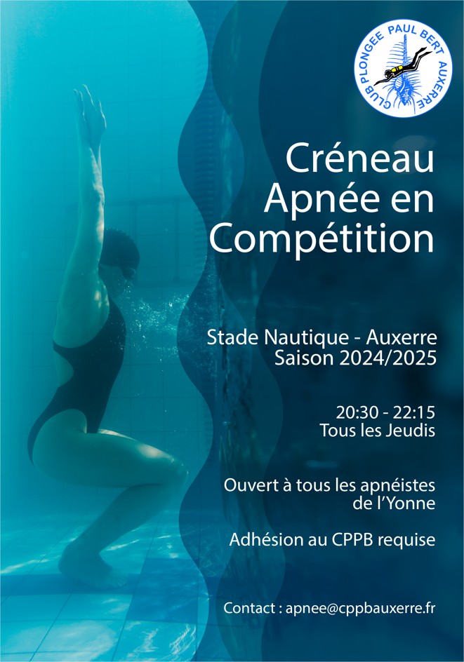 Après validation par le Stade Nautique d’Auxerre, ouverture d’un créneau Apnée “Compétition” les jeudis soir de 20h30 à 22h15 !